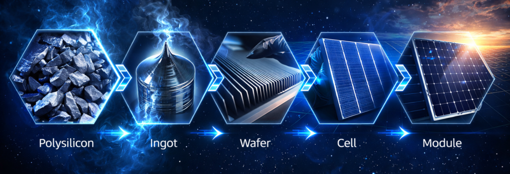 Solar-grade Polysilicon (6N–7N) — for photovoltaic cells and solar modules;
